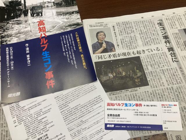 前置きが長くなりました。今朝の高新にも掲載されてるように、来週19日(水)と20日(木)、その「高知パルプ生コン事件」を題材にした演劇が、行われます。場所は県民文化ホールグリーンホール。僕も、この演劇の賛同人のひとりなので、チケット、持ってます。ご興味がありましたら、ぜひ!