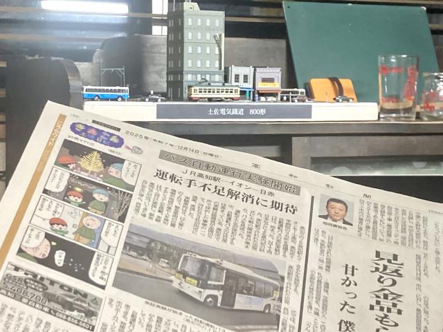 で、高知新聞。昨日からJR高知駅とイオン、日赤の間でバスの自動運転運行実験が始まった、という記事。昨日から今月26日まで、2台のバスで、緊急車両とか周囲の車、人などを検知する実験なんだそう。総務省が国10ヶ所で採択した実験。なるほど。