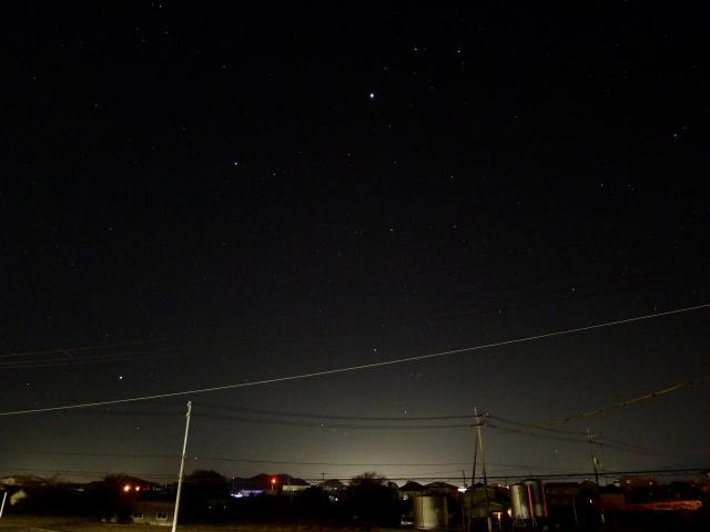 写真は、本社棟2階の窓から撮影した西の空。向こうに潮見台が見えてます。潮見台の上に沈んでいくオリオン座と冬の大三角形。そう。夜明け前の空は、もう、冬が終わろうとしています。中央上の一番明るい星は木星。そのすぐ右上には一目でそうとわかる、双子座のカストルとポルックス。写真右端には五角形が特徴的なぎょしゃ座。カペラは切れて写ってないけど。