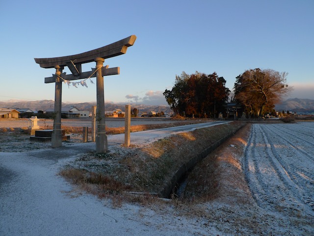 今朝は冷えました。こじゃんと冷えました。空はキレイに晴れ上がっちょります。高知の市内は全然ですが、南国市の方へやって来ると、ご覧の通り、雪が降っちょります。ここは南国市岩村の川原神社。青い空と白い地面に鳥居が映えて美しいですな。向こうに見える北山はうっすらと雪化粧。