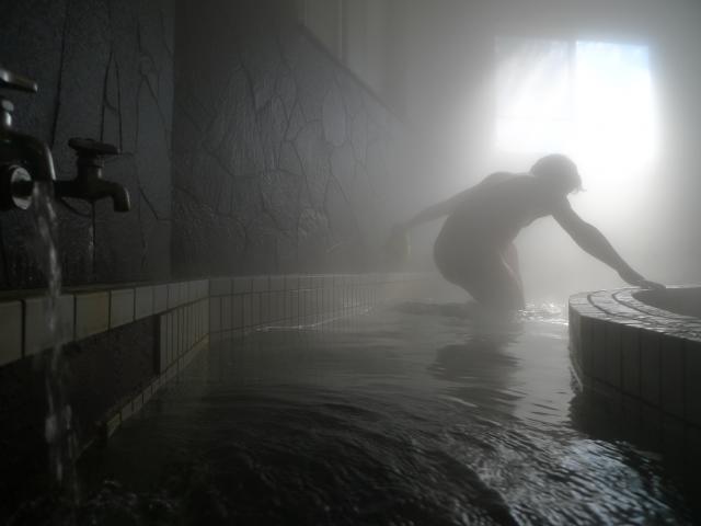 お昼12時からの営業開始で、小生が一番乗り。誰も浴室に居らんので、湯船につかっちゅうところをセルフタイマーで写真を撮ろう。と、セットしてから湯船に入ってたまげました。熱い!