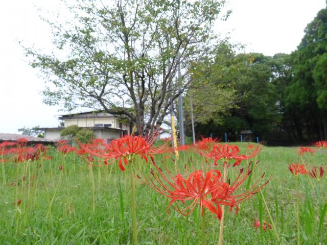 ここは、いつもの野市、上岡八幡宮。今朝はこんな感じで彼岸花がたくさん。秋のお彼岸の頃になるとちゃんと花を咲かせる彼岸花。たいしたもんだ。ほとんど、ズレませんもんね。