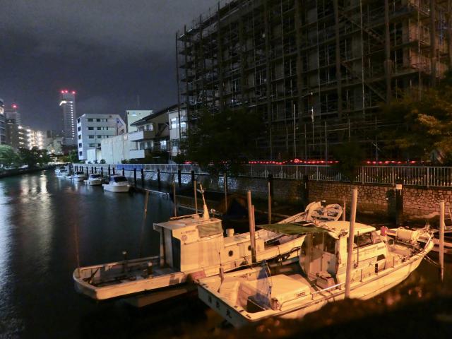 夜明け前の堀川も、こんなに静か。右手の、福留開発さんの建設中のビル、台風対策と思いますが、シートが全部取り払われてました。こないだの写真と比べたらよくわかります。