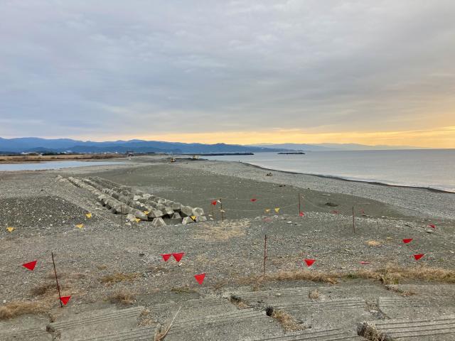写真は、今朝の物部川河口。この浜辺の地形は、僕がここで写真を撮り始めてからでも、劇的に変化してきました。そもそもこんなに段々になってなかったし。自然地形は、人間の手が加わらなければどんどんと、変わる。しかし、過去の事象をキチンと記録してくれている自然地形も、ある。