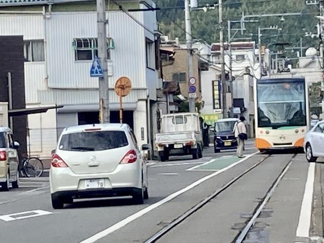 この写真をご覧ください。あの電車は向こう向いて走ってて、曙町東町電停を発車したところ。左の車道を、こらから向こうへの車と、向こうからこちらへの車が相対してるの、わかりますよね。こんな場合、向こうへ走る車が電車の後ろについていくケースがある訳です。するとあら不思議。両方向、右側通行で車が走る、という光景が出現する訳だ。いいねー、まさに「路面電車」。