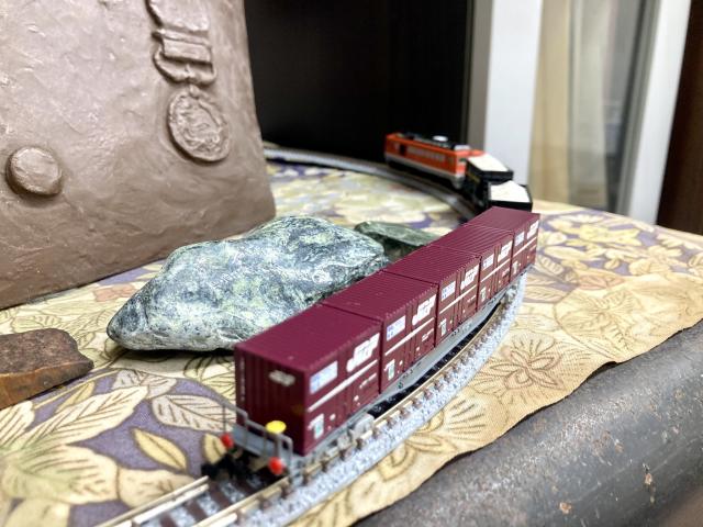 今朝は、先日予告した、貨物輸送が抱える課題について。写真は、NゲージでDF50が引っ張るコキ107に積載されたJR貨物の12フィートコンテナ。格好いいねー。
