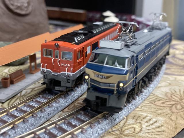 そんな訳で、ついうっかり買ってしまったNゲージのEF6627が、DF50の横を走り抜けてゆきます。どうでしょう。DF50は、高知でも活躍したディーゼル機関車で、僕はDF50が牽引する汽車に乗ったことも、あります。しかし、EF66が牽引する電車に乗ったことはない。宇野から東京まで乗ったことのある寝台特急「瀬戸」は、たぶんEF65だ。