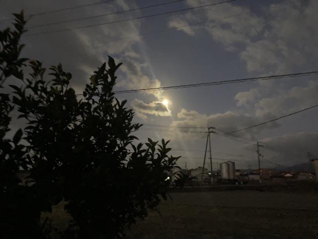 そんな節分の、夜明け前の空に、満月を過ぎたお月様。美しいねー。本社棟前、文旦の樹の向こうに輝くお月様。