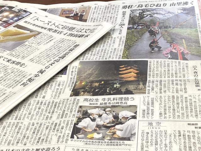 そして。手前の記事。先日このにっこりでもご紹介した「高校対抗!第12回高知家の牛乳料理コンクール」の記事。確かに、高知新聞の記者さん、取材に来られてました。熱心に取材しておられました。ただ、あの日は選挙の投票日。高知新聞も選挙関連の報道が目白押しで、今日、やっとこさ掲載されたのでした。そう言えばあの記者さんも、このコンクール取材の後は選挙取材に移動して朝まで仕事とおっしゃってました。ご苦労様です。