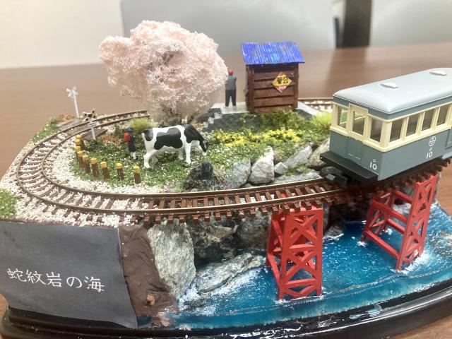 このジオラマは、ティッシュの箱より小さい鉄道。ちゃんと走ります。海の崖は、本物の蛇紋岩。